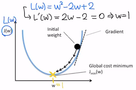 골짜기 가장 밑바닥으로 내려갈 수 있는 현실적인 방법 → loss function의 최소가 되는 지점